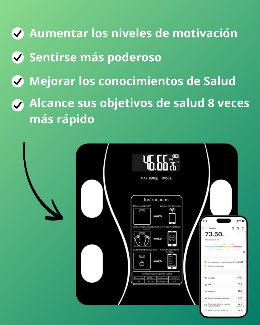 Nuestra balanza inteligente no solo muestra datos: te inspira a mejorar cada día. Al visualizar tus progresos reales.