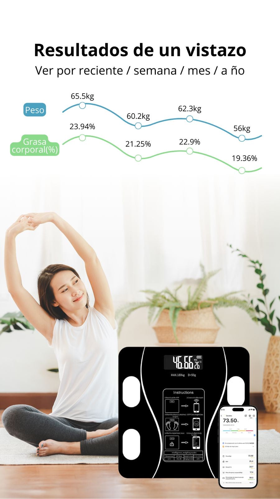 Gracias a su conexión Bluetooth, se vincula fácilmente con aplicaciones móviles (como Fitbit, Apple Health, Google Fit o apps propias) para registrar y monitorear tu progreso en tiempo real. Solo necesitas subirte a la balanza y los datos se transfieren de forma automática a tu dispositivo.